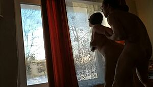 Helga risks public bareback ass fuck by window as people pass