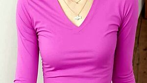 Curvy brunette chris tang slurps massive cock in pov with handjob tits tease and cumshot facial