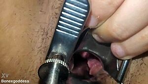 Close-up speculum stretches pink pussy walls wide open