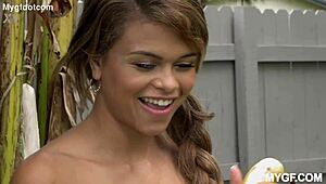 فيديوهات الموز بتميل للجانب الغريب—بنات في مطابخ مشمسة، يقشروا الموز ببطء قبل ما يستخدموه للمداعبة. الطاولات والمرايل بتعطي إحساس منزلي. في فيديو، مفرش طاولة أصفر زاهي كخلفية، بيخلي المشهد بارز بصرياً.