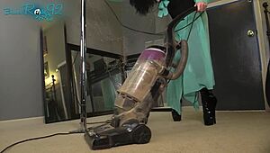 Housewife vacuums seductively in tight hobble boots