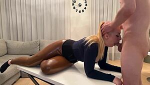 oily big tittied blonde teen in latex pants gives sloppy condom blowjob 😜👄🍆