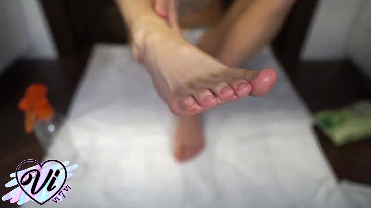 Toying Babe Massages Her Feet with Care