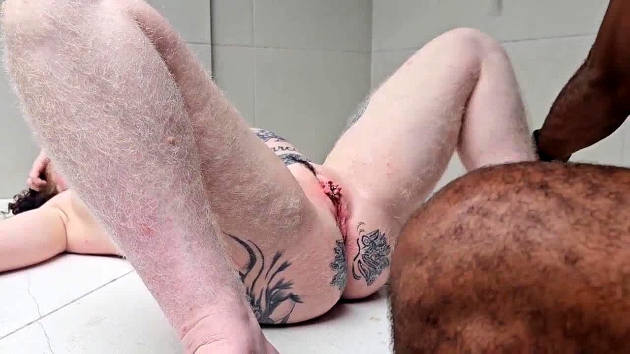 Samen douchen maakt de dikke lesbo geil dus likt ze kut van blonde vriendin