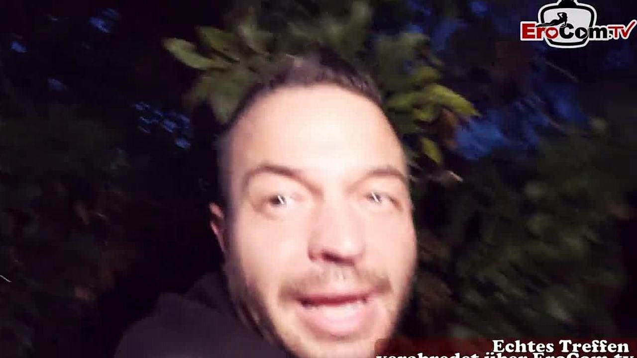 Skinny German blonde milf seduces a guy for outdoor sex.