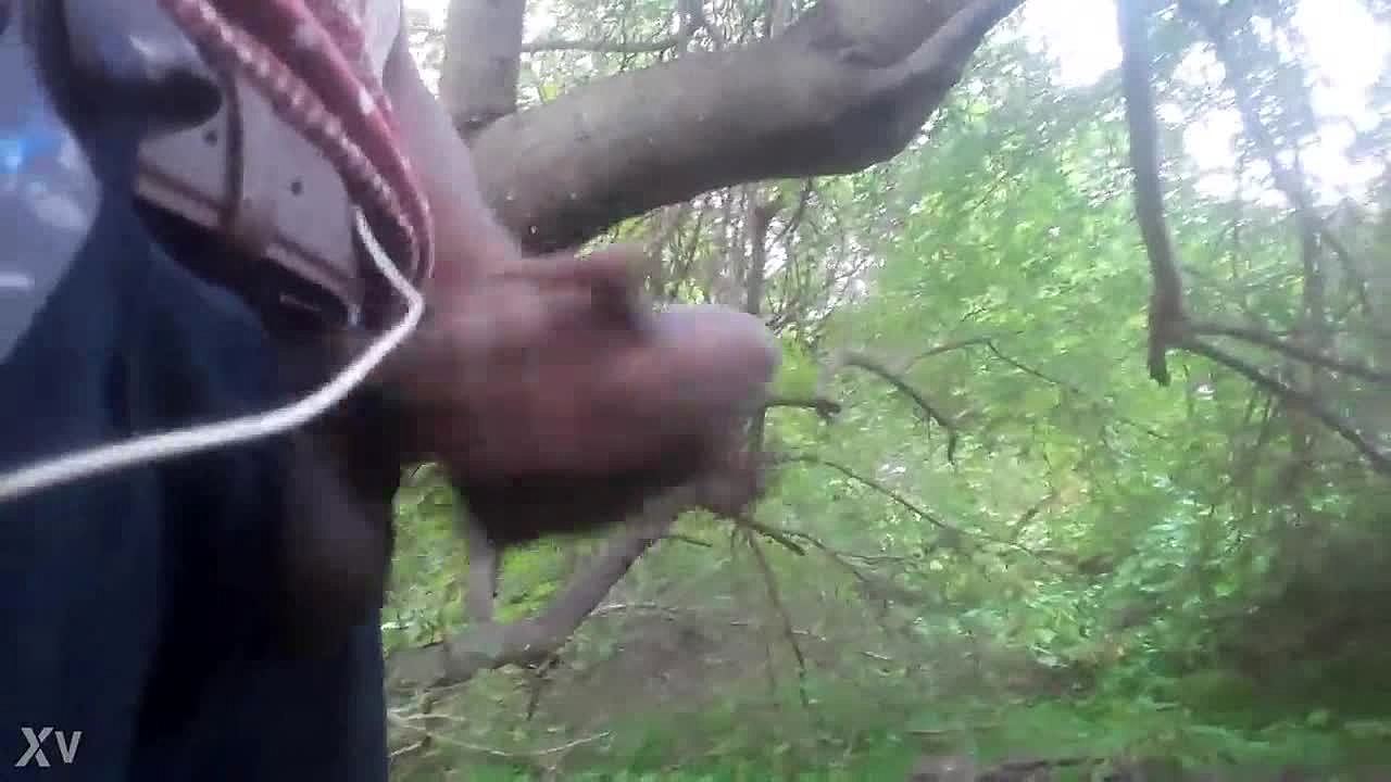 Outdoor masturbation session ends with a cum shot in the trees